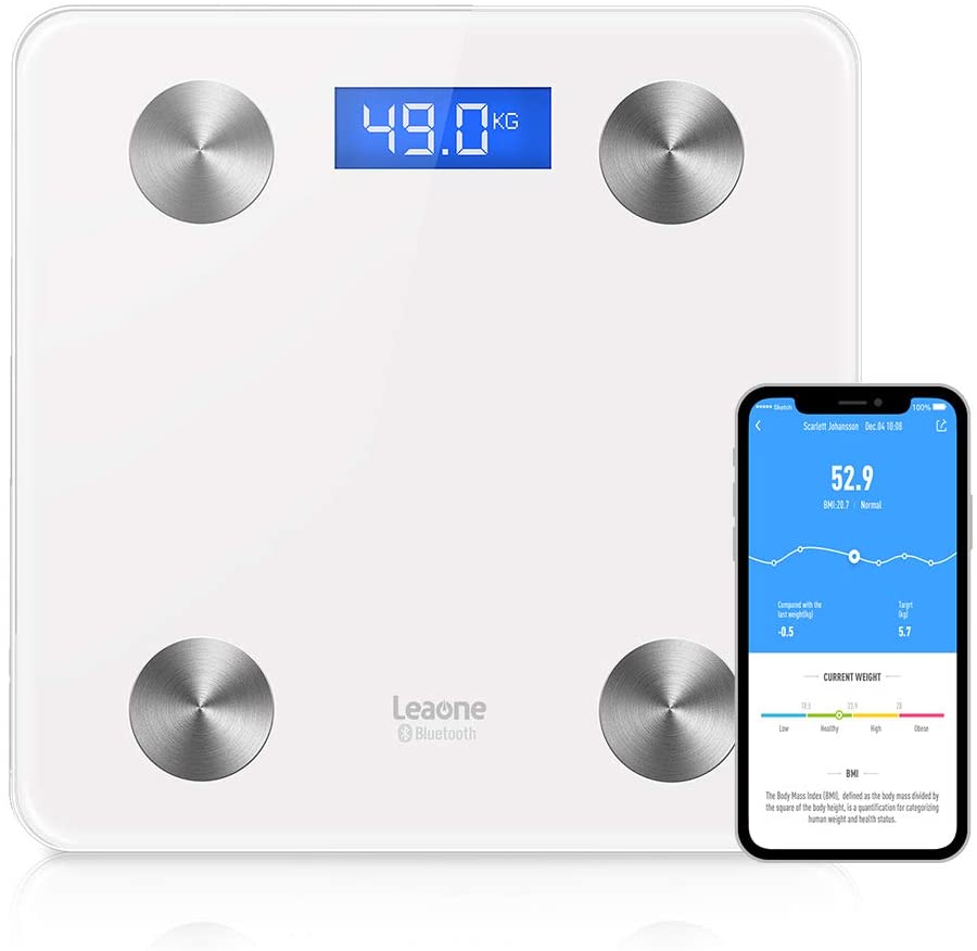 Leaone Body Fat Scale 28x28cm, Blue LCD Display, Smart Bluetooth Digital BMI Weight Scale, Body Composition Analyzer Health Monitor with 6mm Tempered Glass with Smartphone App, 400 lbs, White